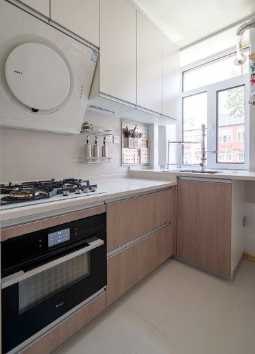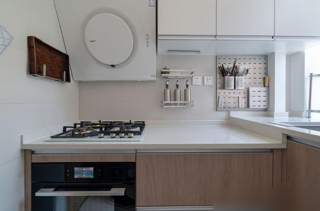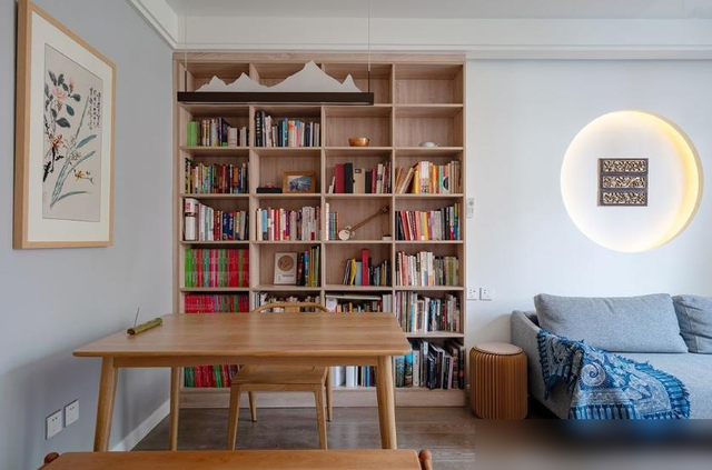 最戳我的是那种“轻中式”的巧思,不像传统红木家具那么沉闷。沙发墙的圆形暖光灯像月亮,餐厅吊灯做成山峦造型,配上木色餐桌和禅意挂画,既有东方韵味又清爽。厨房洞洞板挂工具、卧室嵌入式衣柜,实用和颜值都拿捏了,果然小户型装得好比大房子更显温馨!